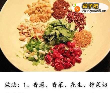 2将花生,香菜,香葱,榨菜切碎备用