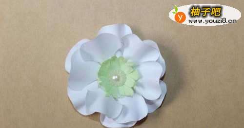 分享一款花瓣是波浪形的纸花,制作十分简单,中间搭配绿色花芯和珠子,特别好看,我们来看一下它的制作办法吧!