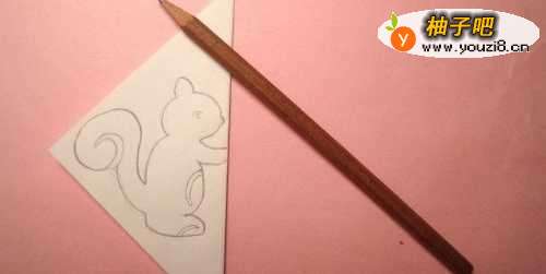 2接着,把正方形卡纸对折一半,旋转45度。并用铅笔在白纸上,画出可爱的松鼠图形,根据对称图形,这里画出半个图形,如下图所示。