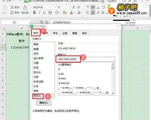 4在“自定义”类型对话框中,输入数字格式【000-0000-0000】,然后点击【确认】;