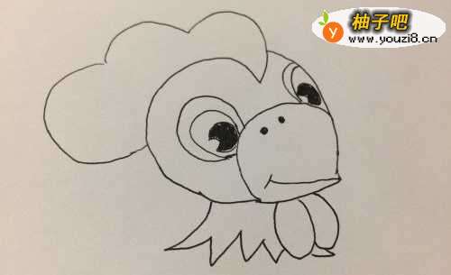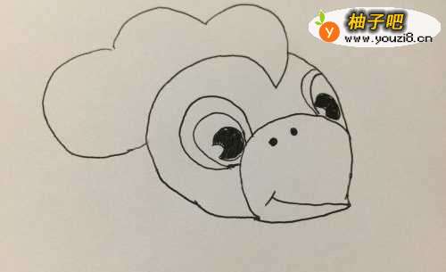 3接着画出两只黑黑的眼睛,还有一个大大的嘴巴,两个黑黑的鼻孔哦。