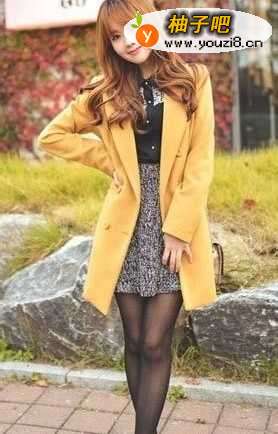 黑色翻领衬衫加入一点灰色拼接设计,显得不那么单调,也与搭配的灰色半身裙上下呼应,颜色简约大气,不过稍显成熟,所以外套选择了柔和淡雅的黄色,展现姑娘娇媚温柔的一面。