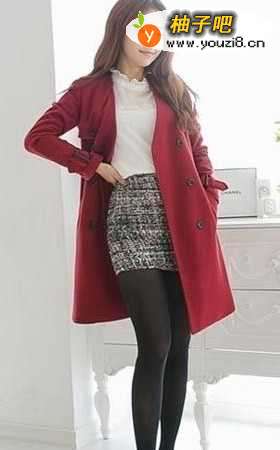 5白色衬衫花边立领设计,显得柔美浪漫,增添复古名媛风情,肩部是薄纱蕾丝拼接设计,更添精致感,下面配粗花呢的包臀裙显得婀罗多姿,外搭酒红色中长外套,很有女人味。