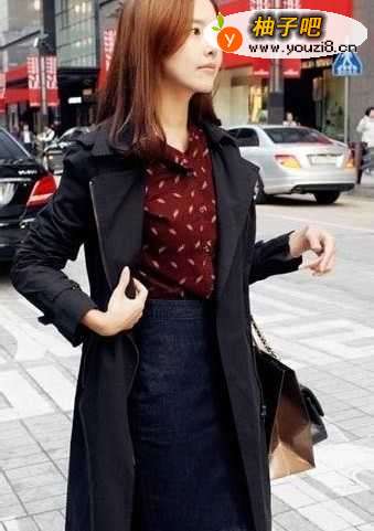 7酒红色印花衬衫优雅复古,凸显迷人气质,下面配深色的牛仔铅笔裙,裙长正好到膝盖,显得知性而优雅,外搭黑色中长风衣,经典大方,成熟迷人。