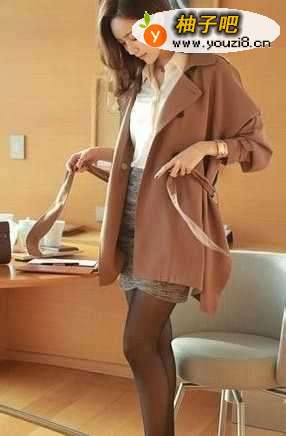 4白色翻领衬衫配灰白色的包臀裙,简约干练的穿搭完美打造出知性女郎的形象,外搭咖啡色风衣外套,休闲时尚的韩版样式,不管是系带穿还是敞开穿,都很有气质。