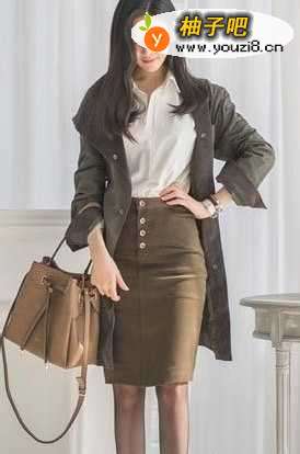 2白色翻领衬衫很显气质,带来ol风的知性干练气质,也不失帅气感,下装配一条军绿色铅笔裙,勾勒出曼妙身姿,这种款式的裙子也特别显气质,外搭军绿色风衣外套,整体颜色很和谐,也展现出都市白领时尚帅气的一面。