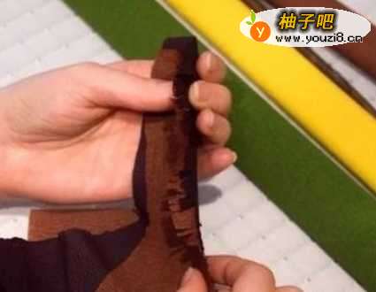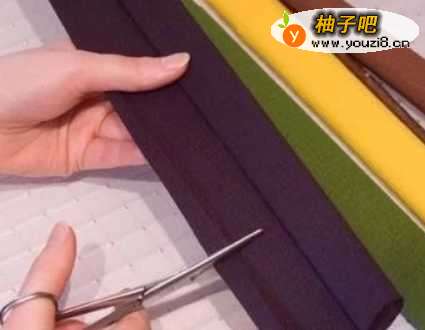用剪刀把深褐色和棕色的皱纹纸,剪出大概8CM宽。然后沿着一边剪成约2CM的细条。