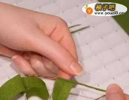 4剪出约2CM宽的绿色皱纹纸条,约9CM长的扎丝。然后用皱纹纸把扎丝包裹起来,并用胶水将其固定。最后把刚刚做好的叶子粘在小枝上。