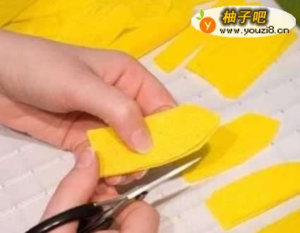 3用黄色和绿色的皱纹纸剪出,7CM长3CM宽的长方形。然后把两边卷起成花瓣的样子。用绿色的皱纹纸剪出,长约9CM宽约7CM的长方形,再把它对折,剪成上尖下胖的叶子形状。同样的沿着边稍微卷起。