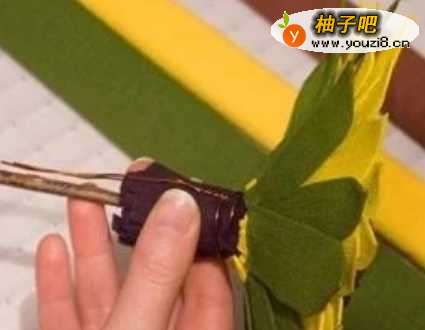 5把做好的黄色花瓣和绿色花瓣,依次地粘贴在花蕊的背部。