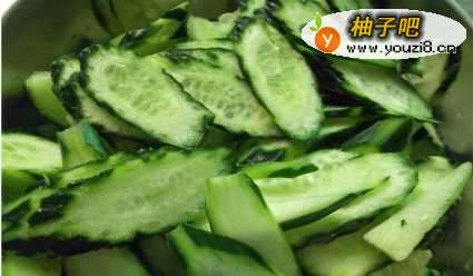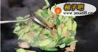 5利用锅中剩下的油,将大蒜、葱、青瓜放在锅中炒透,再放入肉片抛匀,加入黄酒,溅入滚水,用精盐、味精调味,撒上些胡椒粉,用湿淀粉打芡,淋明油、麻油和匀,然后即可装盘配置。