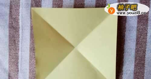 准备一张正方形彩纸,两角对折启用,接着四个角往中心折叠,如图所示。