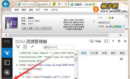 利用IE查询器开启可试听音乐的网页,点击“齿轮”形状的配置按钮,从其扩展菜单中选择“F12 开发人员工具”,或者直接按F12开启。