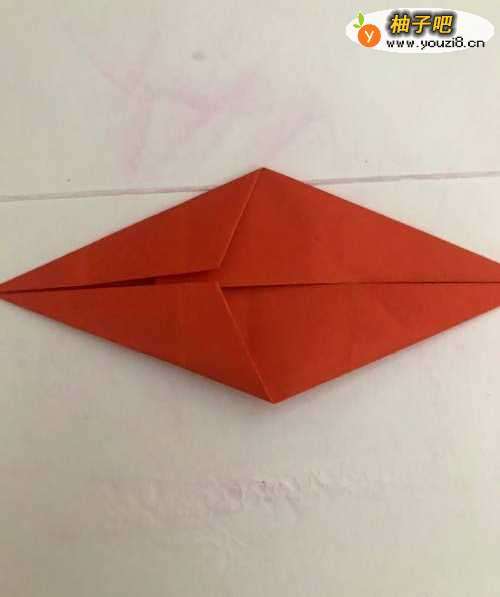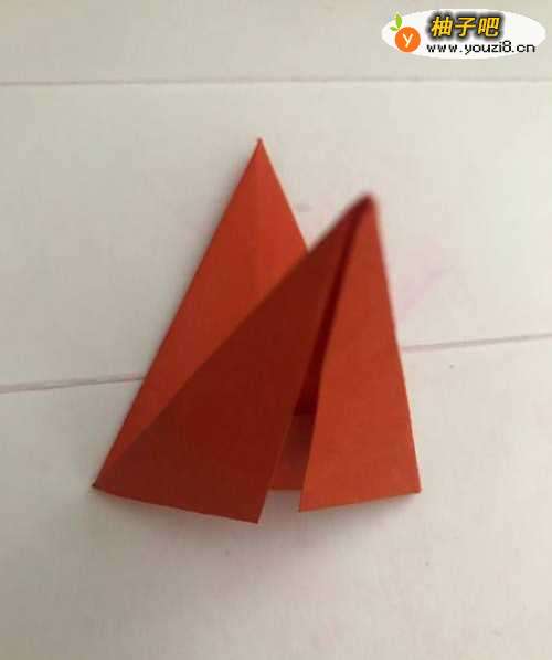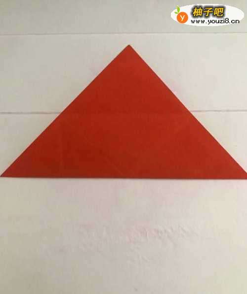 第一步 首先取十分之一张12厘米长 12厘米宽的正方形红色彩纸 对角摆放 然后再从下向上对角折叠整齐