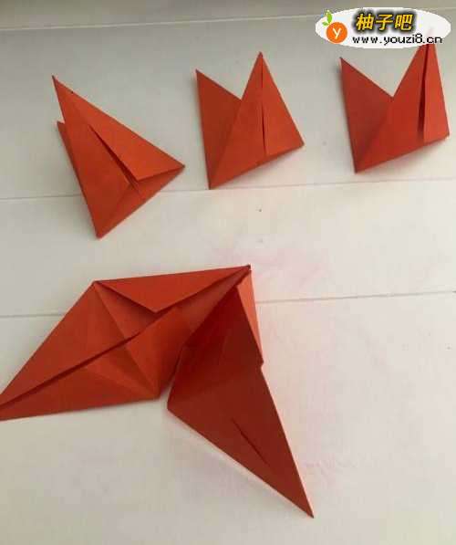 5第五步 折好之后 这是第一个样品 然后再折叠四个同样的 再拿起两个 把它们靠边的三角粘在一起 以此类推