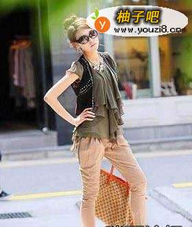 3军装风格的雪纺T恤似乎有点过于中性,加点荷叶边增加了一丝小女人味道,时尚感的铆钉黑色马甲搭配出错层感,米色哈伦九分裤露出了性感的脚踝,而银色配件和银色高跟鞋起到了上下呼应的效果