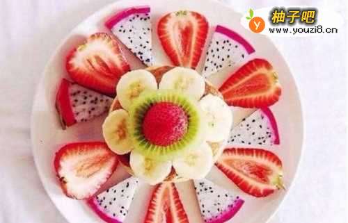 草莓被切成2瓣,火龙果三角,香蕉片,草莓和火龙果交替放在外面,香蕉片和一整颗草莓放在中间。