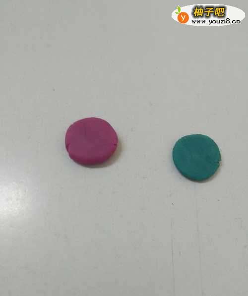 3用紫色和蓝色团两个小圆球,再用手按成圆形的扁片,用来做花朵。
