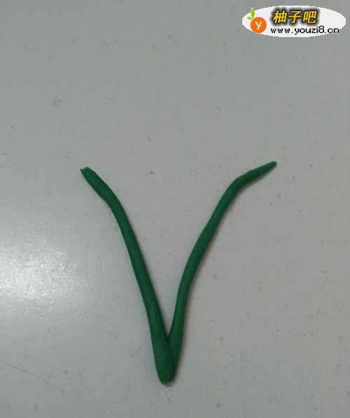 先用绿色搓两个细细的长条,弯弯的,末端粘在一起,当作两朵小花的花茎。