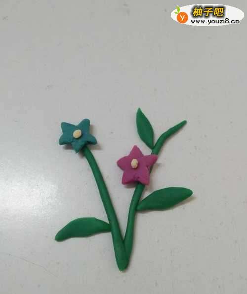 7再用两块白色团两个小圆球,分别粘在蓝色和紫色两朵小花的中间,当作两朵花的花芯,两朵好看的小花就做好了。
