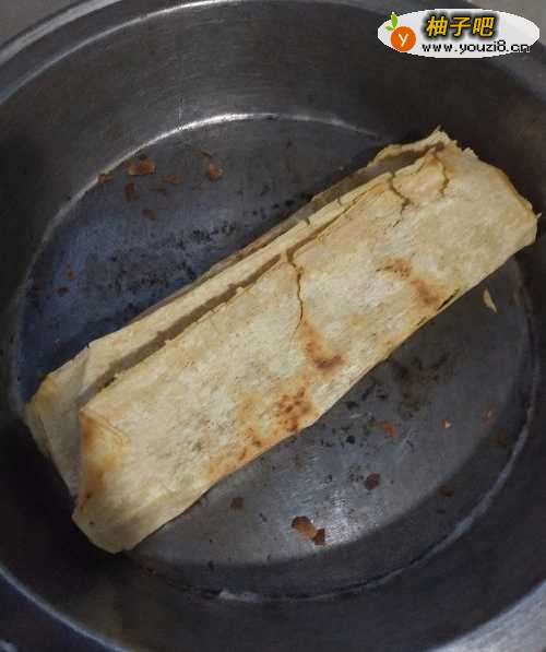 7如图,两面都炕黄后再对折一下,取出即可食用。