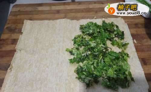 3如图,取出一块煎饼,铺开后放上菜,只要放一半哦。