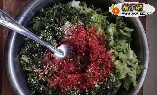 2如图,把切好的生菜和荠菜放进小盆里,加入适量食盐、五香粉、鸡精拌匀。