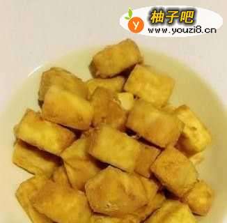 3油温五成热,下入裹好干淀粉的豆腐块炸至金黄色,捞出,备用