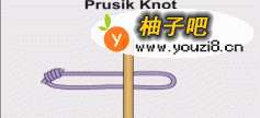 4将绳子通过单结将旗帜固定在绳子上,再将绳子穿过上面打好的旗杆头结上的绳圈,并将绳子两端通过旗杆结连接形成闭路。之后在护旗杆上打双套结将绳子固定在护旗杆上。