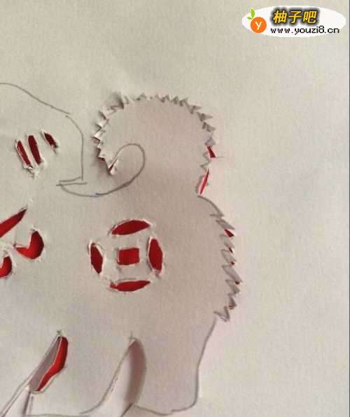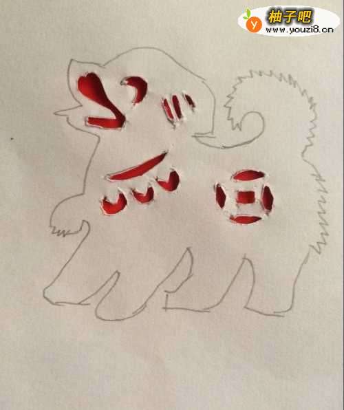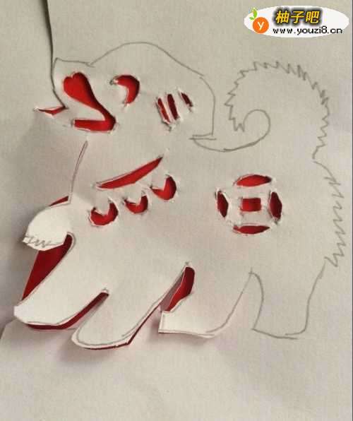 6全部剪好后的样子。有铅笔画的痕迹不太美观,能用橡皮擦擦掉,也能翻过面来观看。我们把旺旺狗翻过来看看;这样旺旺狗剪纸就完成了。