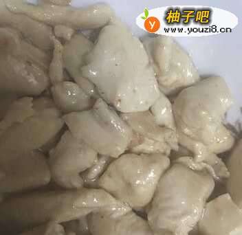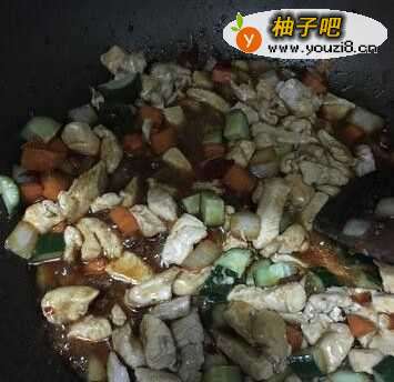 8锅中放底油,中火,将鸡肉炒变色即可,成出备用。