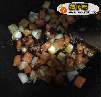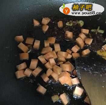 9锅中放底油,小火,放姜和蒜爆香,放入郫县豆瓣酱两勺,依个人口味增减量。炒出红油放入胡萝卜丁。