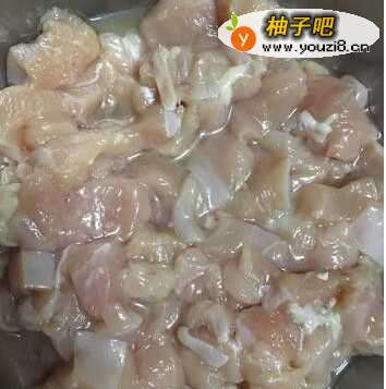 鸡胸肉洗净,切成肉丁,然后放入料酒,少许盐,花椒面,干淀粉抓匀,腌制10分钟左右。再次期间准备其他配料。