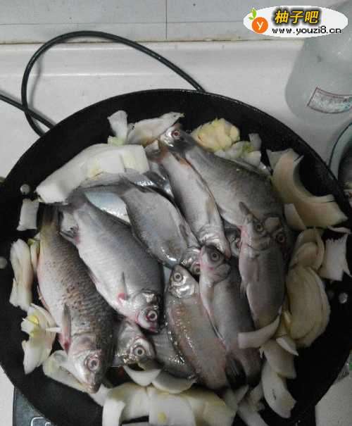 3把准备好的小白条鱼一个一个的放入锅内,注意要一条一条的放好,到最后起锅时不容易把小白条鱼搞断。