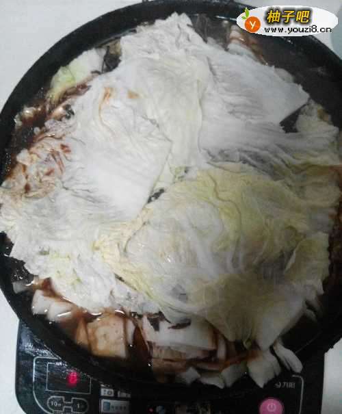 2把洗净的大白菜放入锅内打底,防止沾锅。锅内放入少量的水并放入适量的酱油。