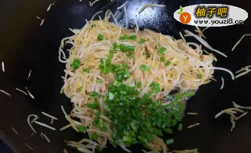 77.最后加点葱花进行翻炒,出锅,香喷喷的豆芽炒肉就做好了。