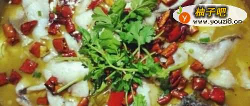 11鱼片熟透捞出,锅里烧油泼在提前放好的干辣椒,葱花,麻椒。最后放点香菜点缀一下。
