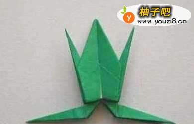 5下面该折青蛙的四肢了,将一条前腿向前折出,开启,得到折痕,再以相反的方向折过去。用同样反向翻折的方式折出后腿。