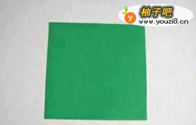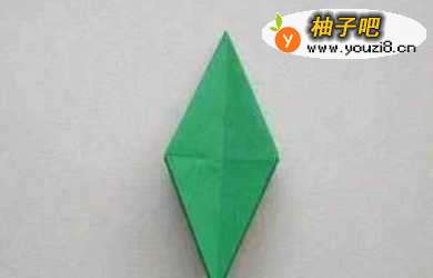 拿出准备好的绿色正方形折纸,将其沿对角线对折,再对折,开启,从中间凹过去,变成如图所示的样子。接着用手指将右边的口开启,折向左边