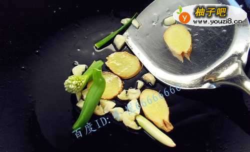 6锅里倒入少许的玉米油(不喜欢不放也能),将葱姜蒜放进锅里煸香。
