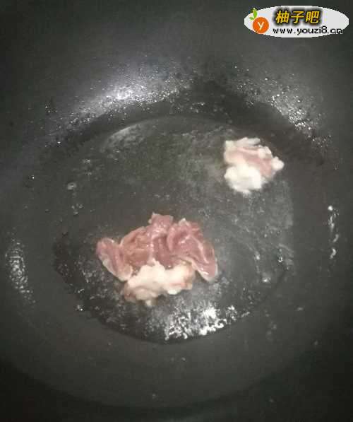3接下来进行炒菜。放入适量的食用油,把猪肉放进去。