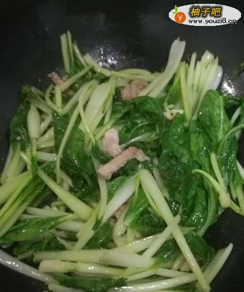 5先将白菜梗放进去炒至五分熟左右,因为如果跟叶子放进去会很容易煮软煮熟,味道不好。再放白菜叶子。