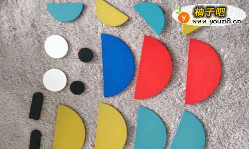 准备好蒙氏几何积木。此处用到的是5个手指形、5个大半圆、1个白色圆形、4个黑色小圆形、2个香肠弧形、3个三角形,如图所示。