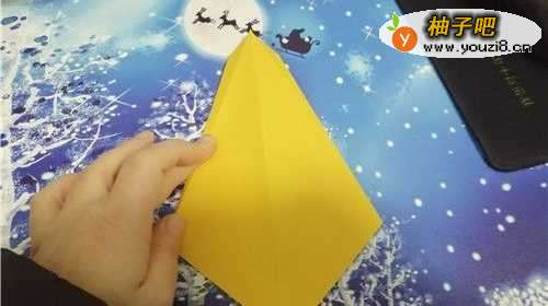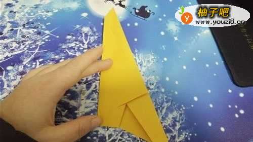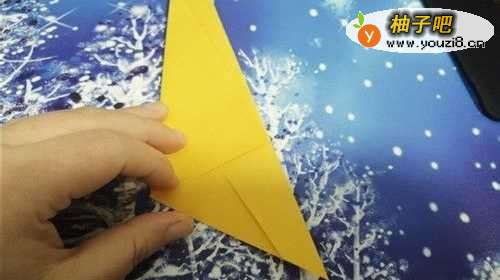 5折好后,我们把上面的角向下折,如图一。再把尖角向内折,如图二的样子,鹦鹉的嘴巴就出来了。