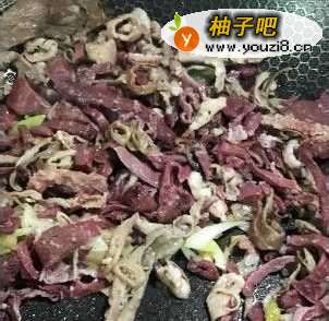 羊杂切碎,温水洗净,焯水。葱切碎,姜切丝。