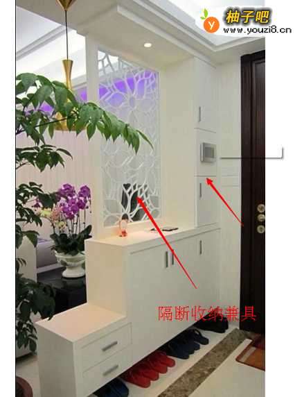 7当鞋柜背面靠在墙上的话,鞋柜的上方能做成衣柜,增加收纳空间,当鞋柜侧面靠在墙上的话,鞋柜的上面能做成博古架,也能是镂空的隔断,这个根据实际情况而定。