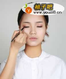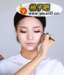 3Step3. 眼影 微珠光浅咖色眼影对眼部进行全包围式打底,眼尾部用微珠光石榴红色加深层次,眼头用香槟色提亮,各颜色眼影过度要柔和。