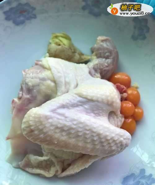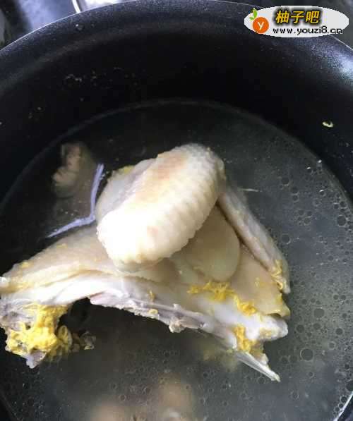 2烧一小锅水,水开后,把鸡肉放进锅里,再放些姜去腥。盖上盖子煮15分钟,中途记得翻面煮。