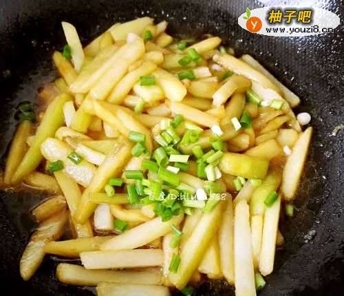 9放入调味料之后,把土豆和茄子翻炒均匀,放入小葱。