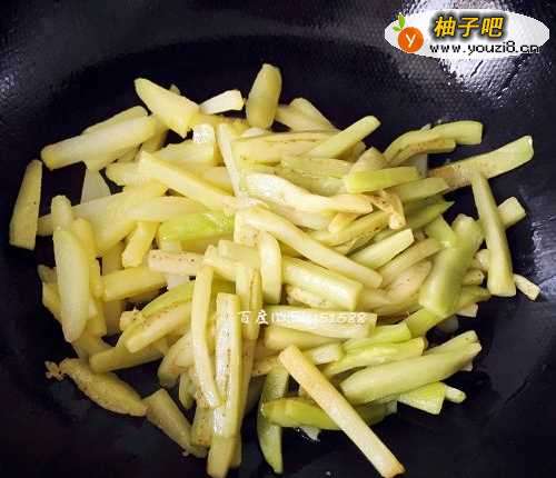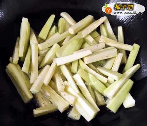 5烧热锅放油,不用放那么多油。先放入茄子,将茄子稍为炸一下,变软了之后,捞出来备用。